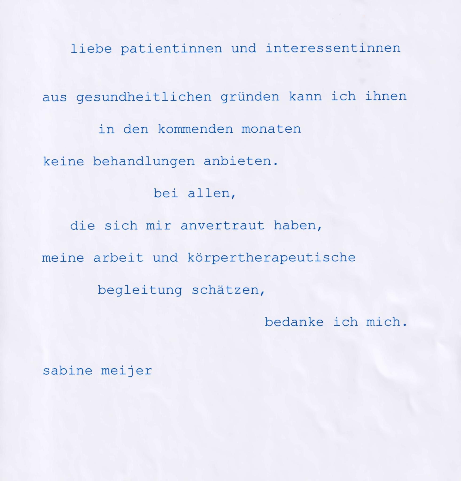 Ich habe die Ambition im Rahmen meiner fachlichen Kompetenzen und menschlichen Qualitäten und Möglichkeiten einen Teil zur Gesundung, bzw. Gesundheitsförderung der Patientinnen, Frauen, beizutragen, die sich mir anvertrauen.